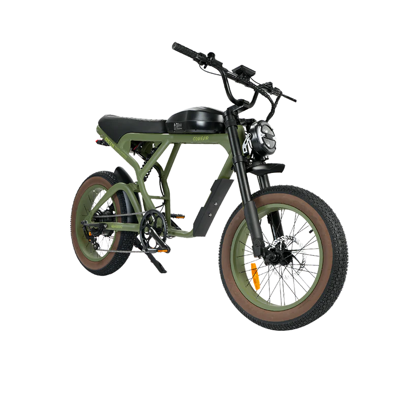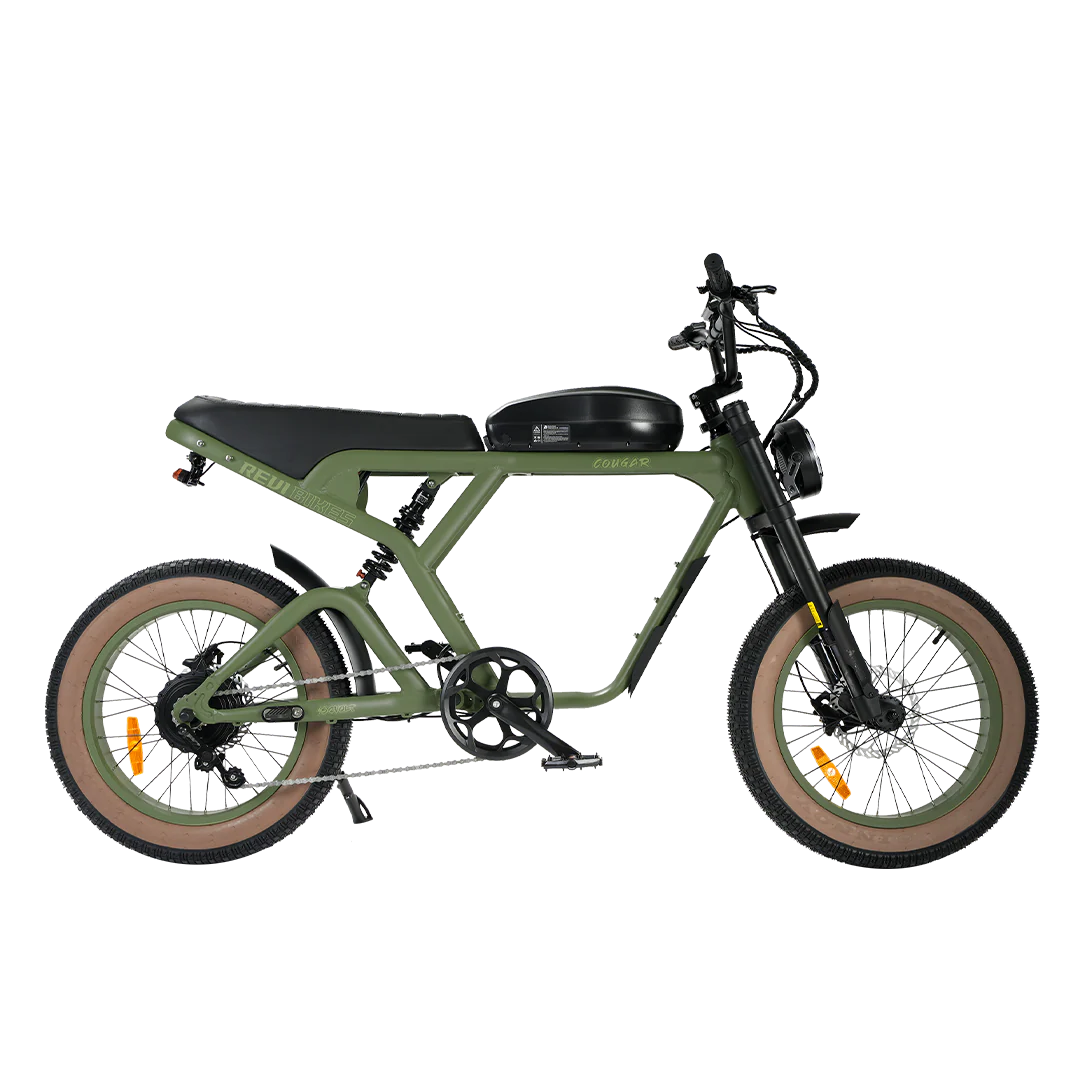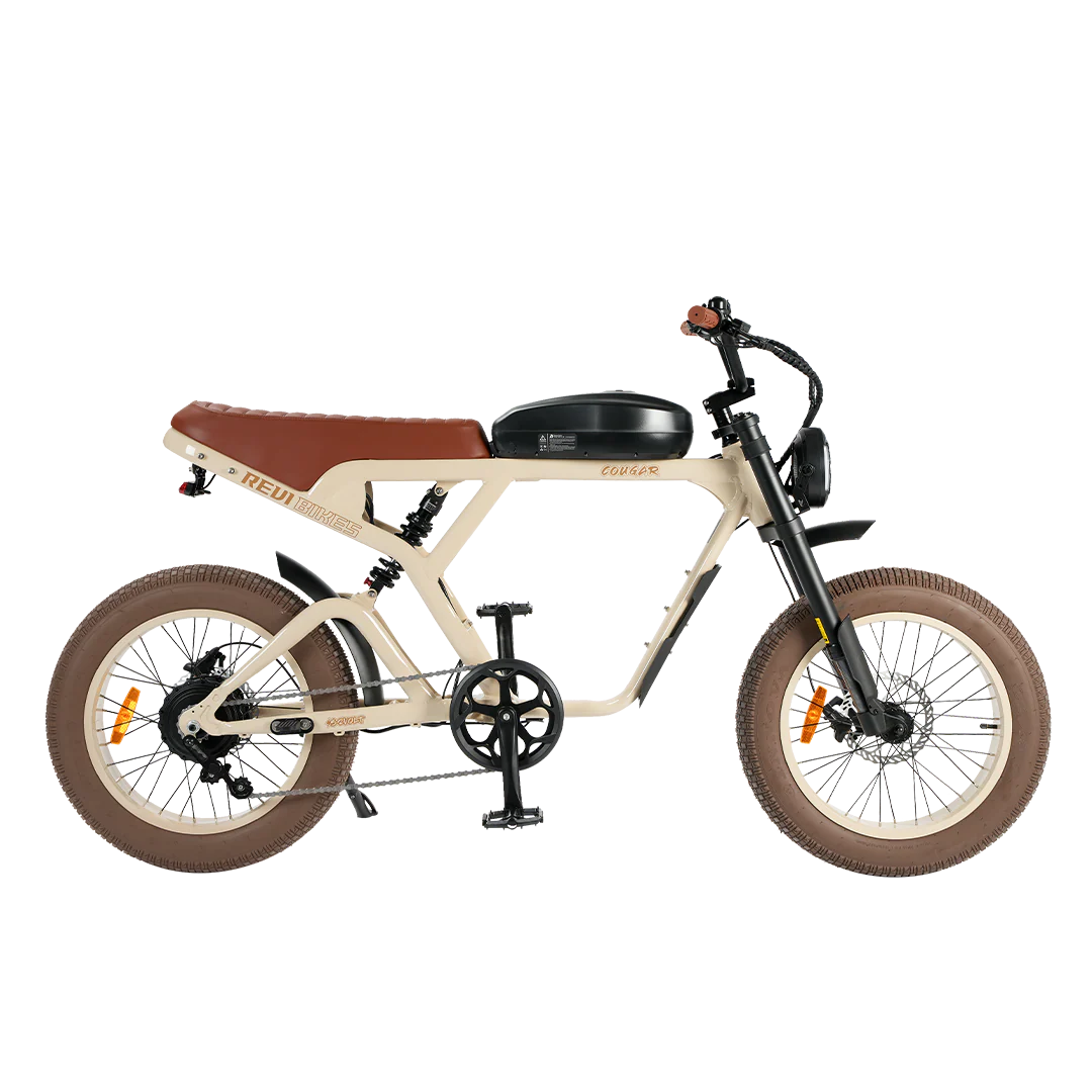 The Cougar is styled like a modern moped — combining robust off-road performance with city-ready flair. It's built on a 6061 aluminum frame and equipped with full suspension (front and rear), hydraulic brakes with 180 mm rotors, integrated lighting including turn signals, and a full-color display complete with USB charging.