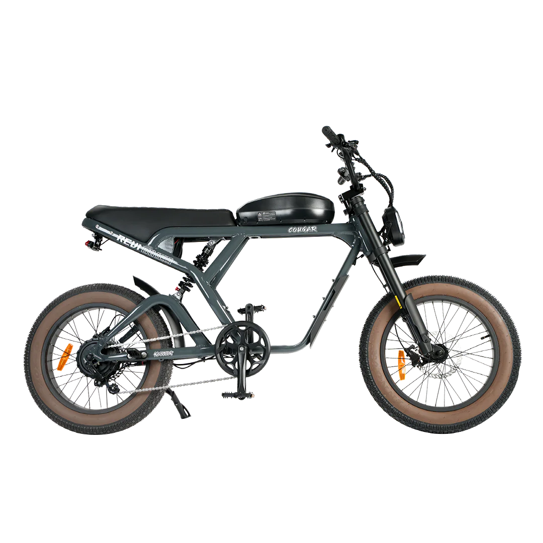 The Cougar is a powerful, well-equipped e‑bike built for riders who want serious performance and rugged durability. Weighing around 80 lb with its battery, it offers a solid balance of power and portability.